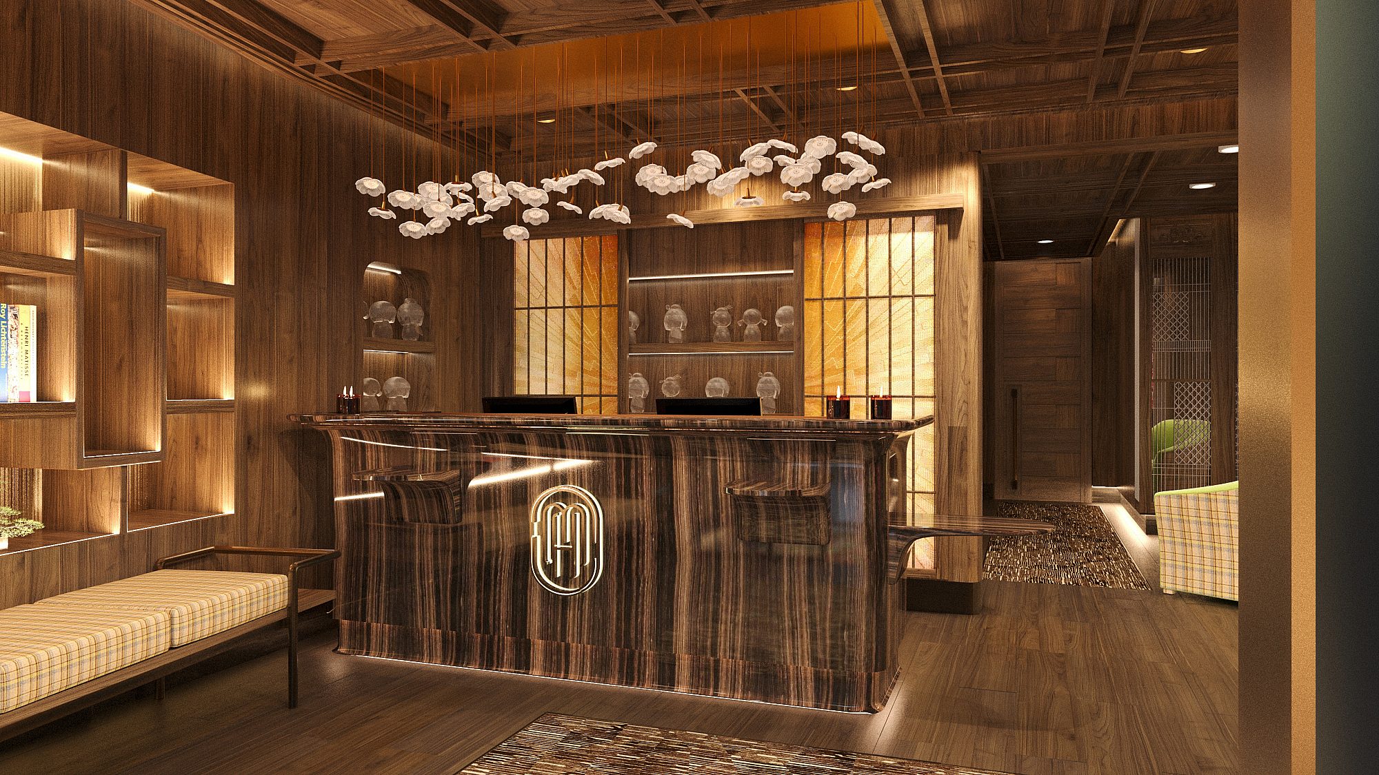 The design blends natural materials—wood, stone, and bronze—with soft, organic lines and subtle lighting. Inside, bespoke Lalique artworks and crystal details create an ambience of understated luxury, exemplified by the signature golden anemone chandelier in the lobby.